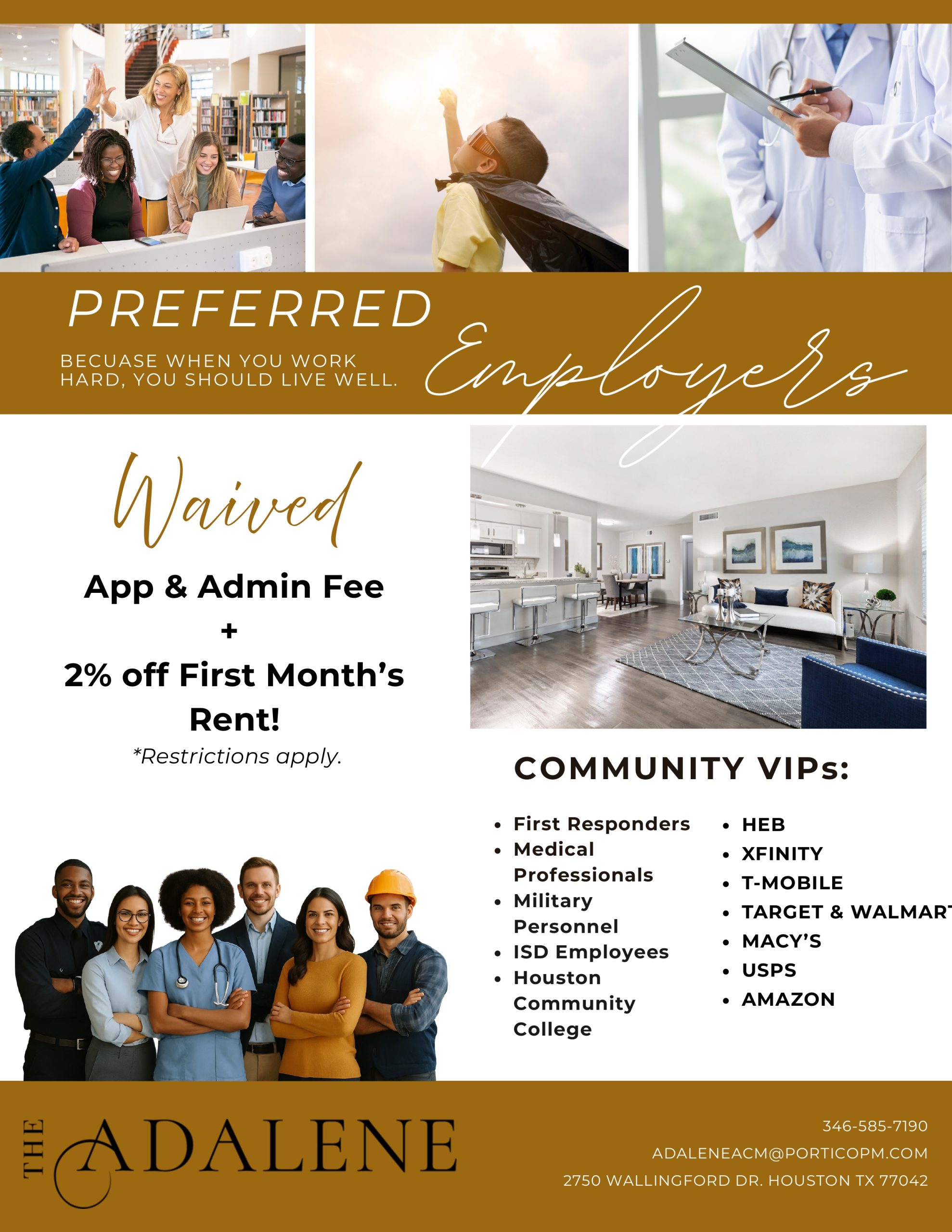 - Waived App & Admin Fee + 2% off First Month’s Rent! * Restrictions Apply.